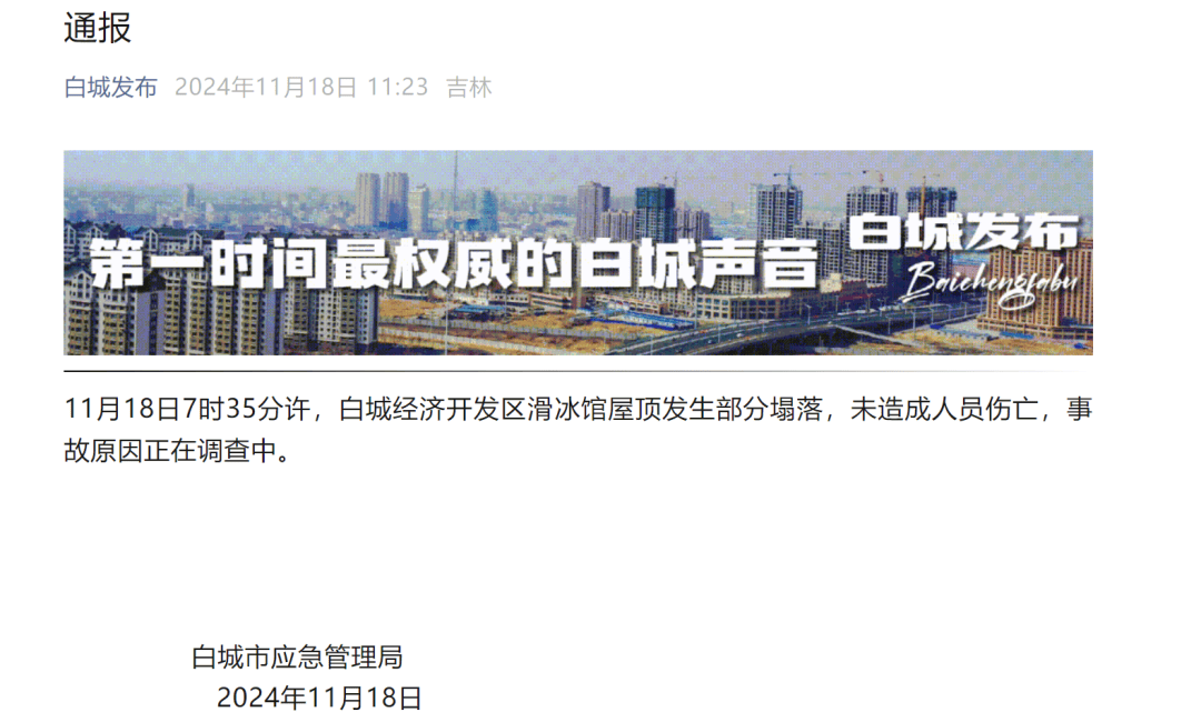 18日“白城发布”通报称:11月18日7时35分许,白城经济开发区滑冰馆屋顶发生部分塌落,未造成人员伤亡,事故原因正在调查中。据央视新闻,记者从吉林白城市消防、事故现场处置民警处了解到,今早白城市滑冰馆部分房顶发生坍塌,目前未造成人员伤亡。