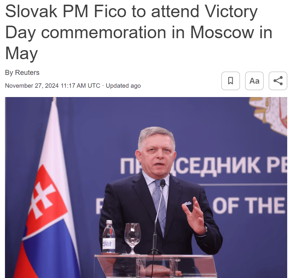 报道称,自俄乌冲突爆发后,菲佐领导的斯洛伐克政府一直在寻求改善与俄罗斯的关系。菲佐此前曾表示希望参加明年在莫斯科举行的纪念活动。27日,他正式宣布已接受俄罗斯的官方邀请。