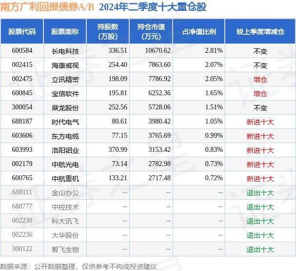 南方广利回报债券A/B为债券型-混合二级基金,根据最新一期基金季报显示,该基金资产配置:股票占净值比20.25%,债券占净值比103.82%,现金占净值比0.31%。基金十大重仓股如下: