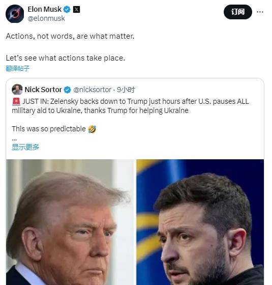 马斯克评论与泽连斯基相关帖文:“重要的是行动而非言论”