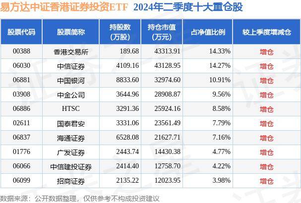易方达中证香港证券投资ETF为指数型-股票基金,根据最新一期基金季报显示,该基金资产配置:股票占净值比97.55%,无债券类资产,现金占净值比1.53%。基金十大重仓股如下: