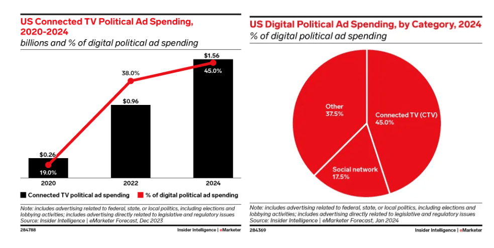 随着观众不断“切断有线”并拥抱流媒体,政治广告资金也在做出类似的转变。虽然传统电视仍占据政治广告支出的多数份额,但联网电视(CTV)预计在2024年将迎来大幅度跃升,政治广告支出预计相比2020年飙升500%。这一增长将占到所有数字政治投资的近一半,并超过总联网电视广告支出的 5%。
