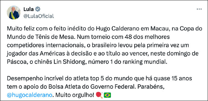 昨日晚,巴西总统卢拉发文:“非常高兴看到雨果·卡尔德拉诺在澳门乒乓球世界杯上取得前所未有的成就。在这场有48名国际顶尖选手参赛的比赛中,雨果击败了世界排名第一的林诗栋,首次代表美洲选手进入决赛并夺得冠军。”