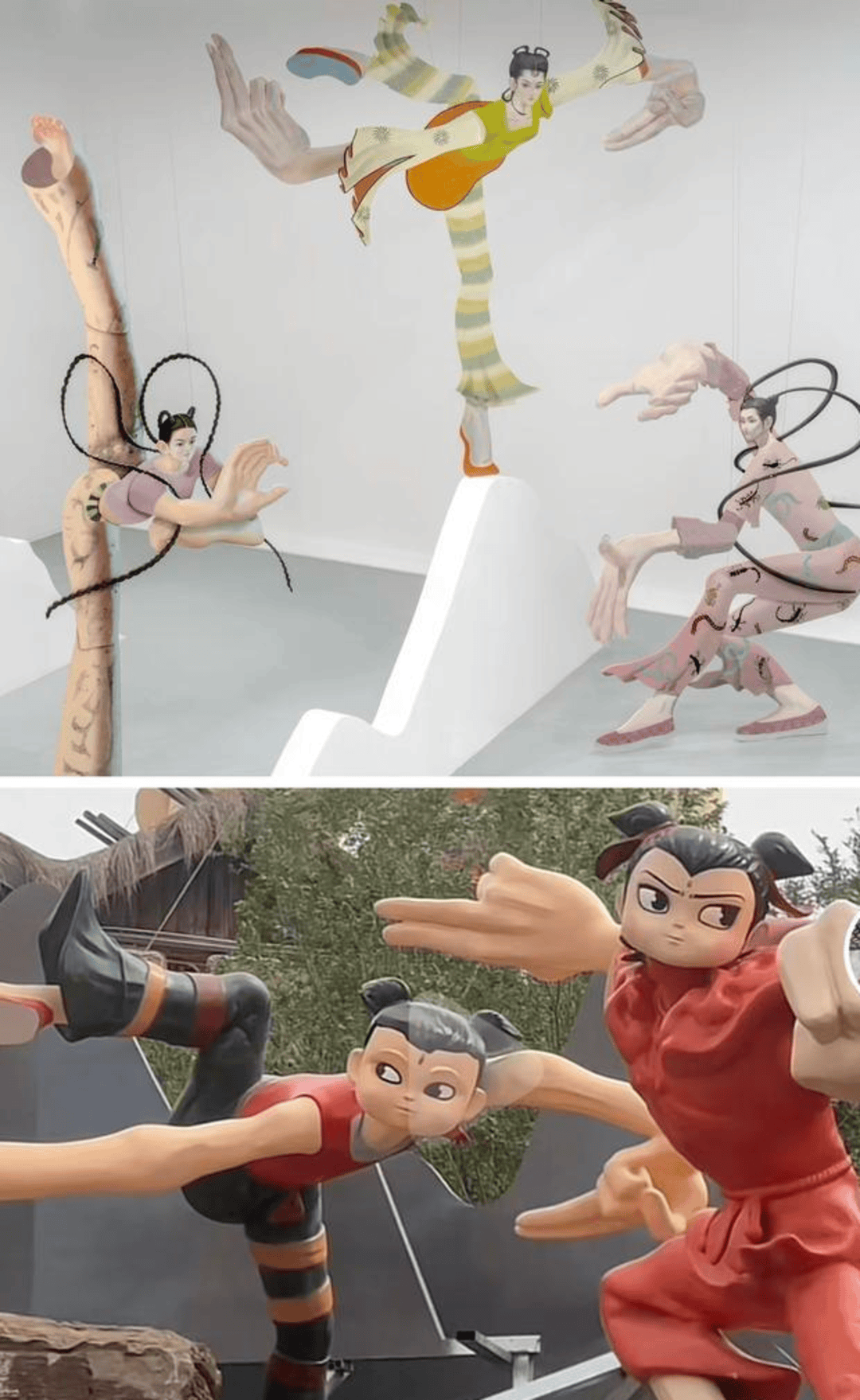 13日,陈思作接受封面新闻记者采访时表示,其原创绘画作品《十八掌》于去年12月起在上海X美术馆首展,通过8件作品展现一系列现代女侠形象。“有了解我作品的人告知,临汾哪吒乐园这组在抄我的作品,结果我发现每一个雕塑动态都是用我的创意设计的。估计是拿我小红书发表的原图(木板绘画装置)再去渲染的3D模型,然后换的哪吒头部模型。”