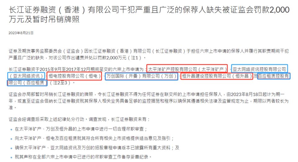 证监会之前暂时吊销容许长江证券融资担任保荐人的牌照,为期一年,或直至证监会信纳长江证券融资就其保荐人相关业务具备足够的监控措施和程序以确保其遵循相关法律及监管规定为止,以期限较后者为准。暂时吊销长江证券融资的牌照,是证监会因该公司在担任其于2015年9月至2017年12月期间提交的六宗上市申请的保荐人时没有履行其责任而针对它所采取的其中一项纪律行动。