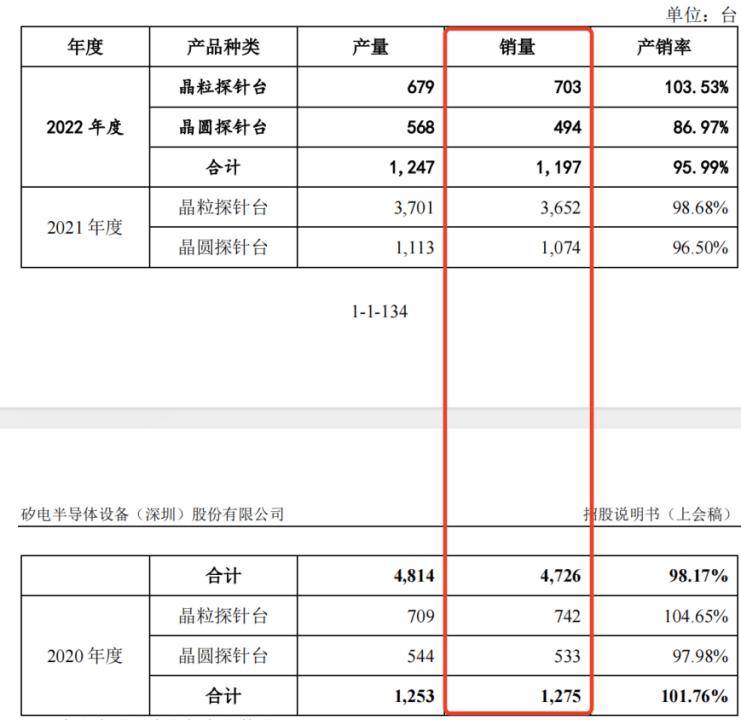 而招股书“主要产品的销量和平均单价分析”处却显示,2020年-2022年,矽电股份晶粒探针台的销售数量分别为660台、1,469台、1,992台,与前述相差了-82台、-2,183台、1,289台。