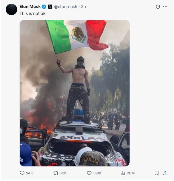 此外,马斯克还发布了一张抗议者赤裸上身挥舞墨西哥国旗的照片,并配文称“这不行”(This is not ok)。