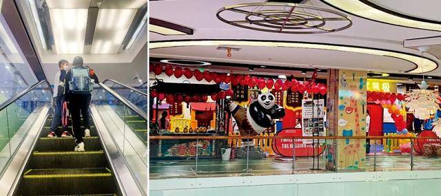 右图:北京新华年购物中心3层,大部分的教培店铺仍在经营运转,一家武术培训机构用门店挂满锦旗、摆放着功夫熊猫的立牌以吸引顾客,店铺里传来孩子们上课的欢闹声。摄影/本刊记者 王诗涵